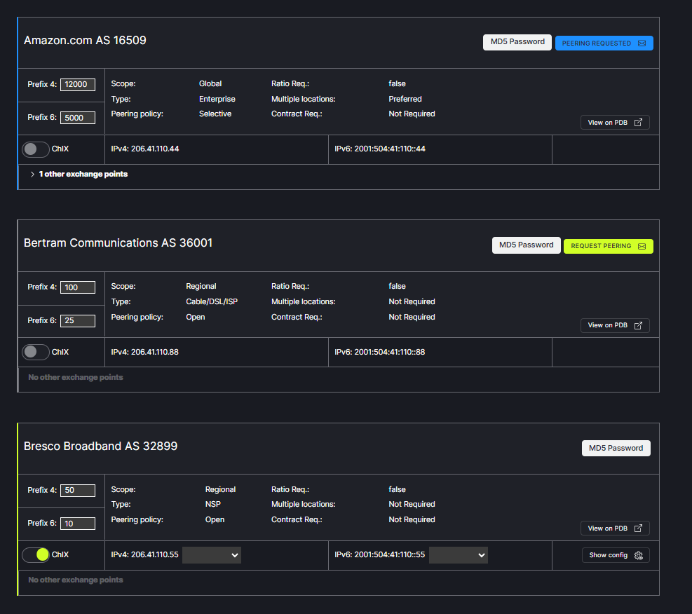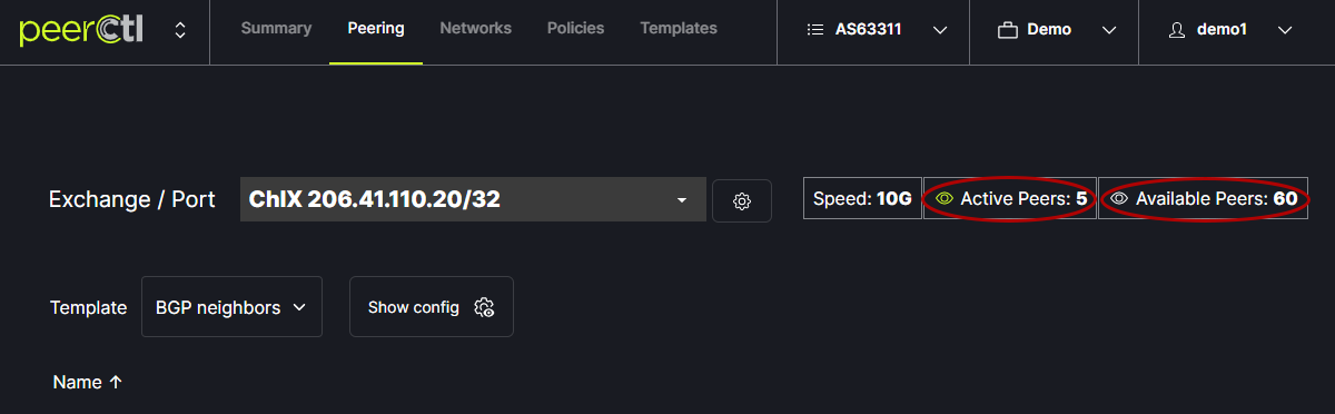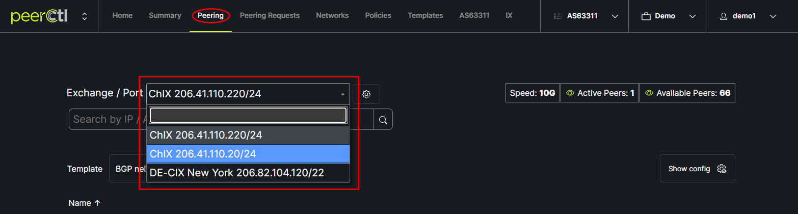From the Peering tab in the header menu, Choose the Exchange/Port to be viewed from the drop down box at the top of the window. The data displayed is populated from PeeringDB. Note: It is important to keep your PeeringDB account up-to-date to produce the most accurate data on PeerCtl.