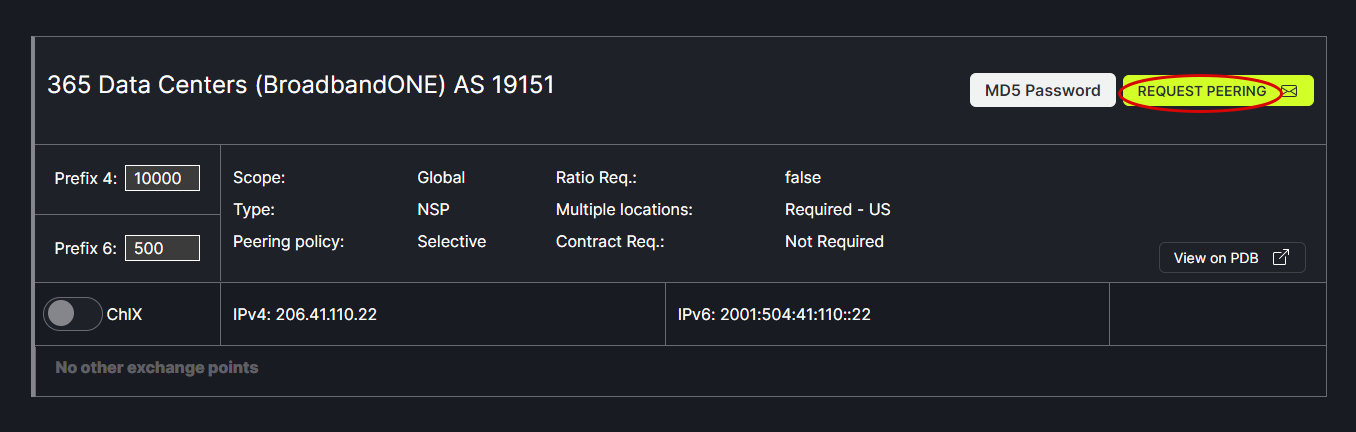 Peering page option: Click on the Peering tab in the header menu. Then, click on Request Peering.