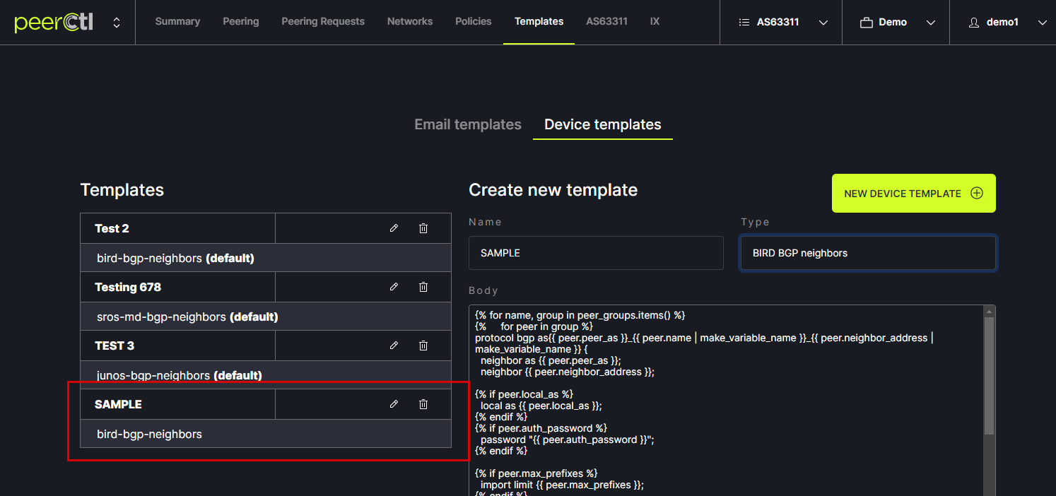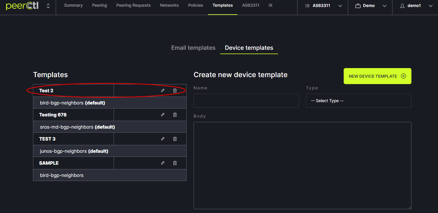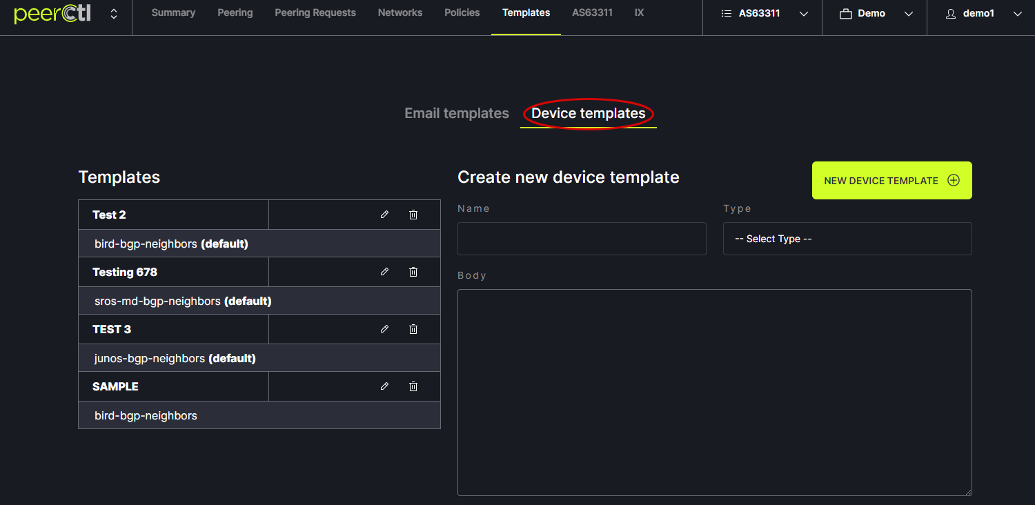 Add a new Template by entering a Name, choosing the Type from the drop-down menu, editing the text in the Body and clicking Save. Note: The templates available for configuration generation are dictated by the device type specified in deviceCtl. Currently the default device type in deviceCtl is set to junos. Templates for other device types can be created but will not appear in configuration generation unless the associated device type is specified in deviceCtl.