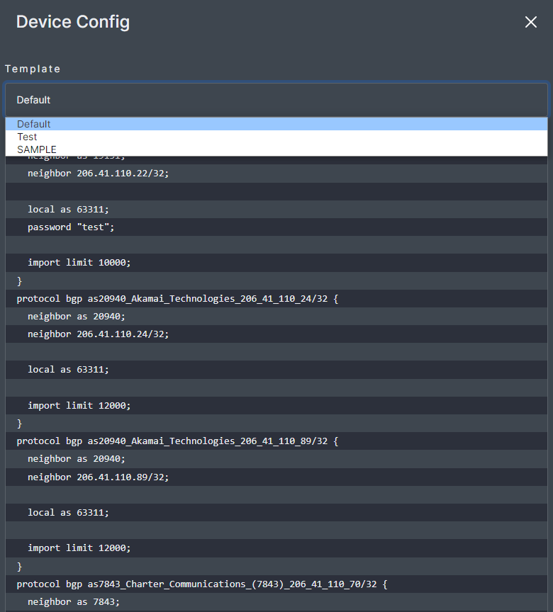 The configuration specifications for the new Template will appear in the popup box. The text can be copied for pasting into router configurations using the Copy to Clipboard option at the bottom of the box.