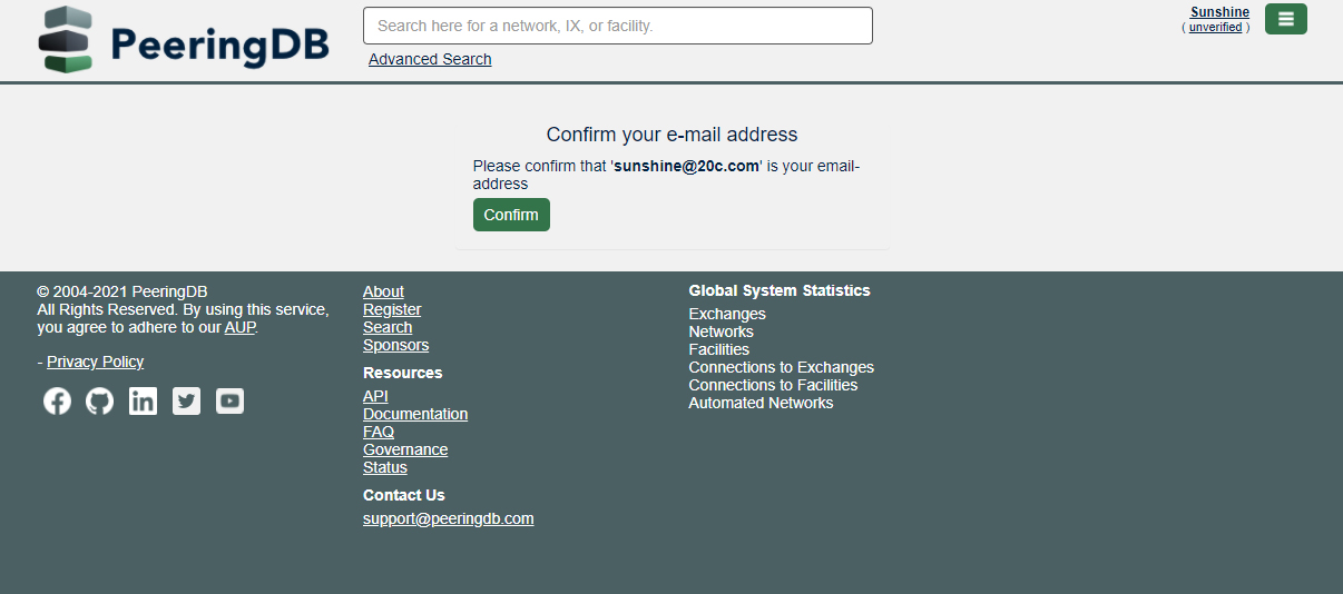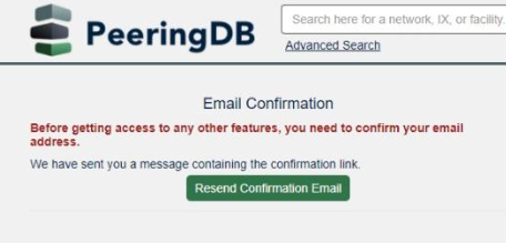 The PeeringDB confirmation page will pop up. Click Confirm to confirm the email address you provided.