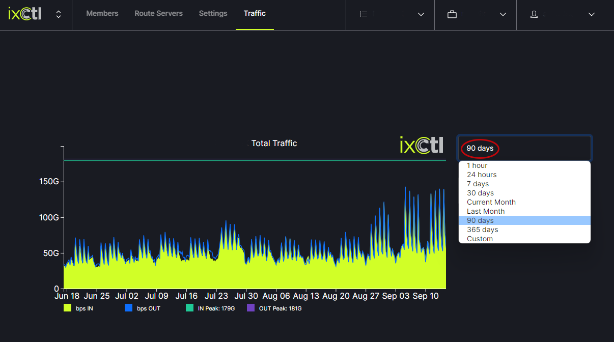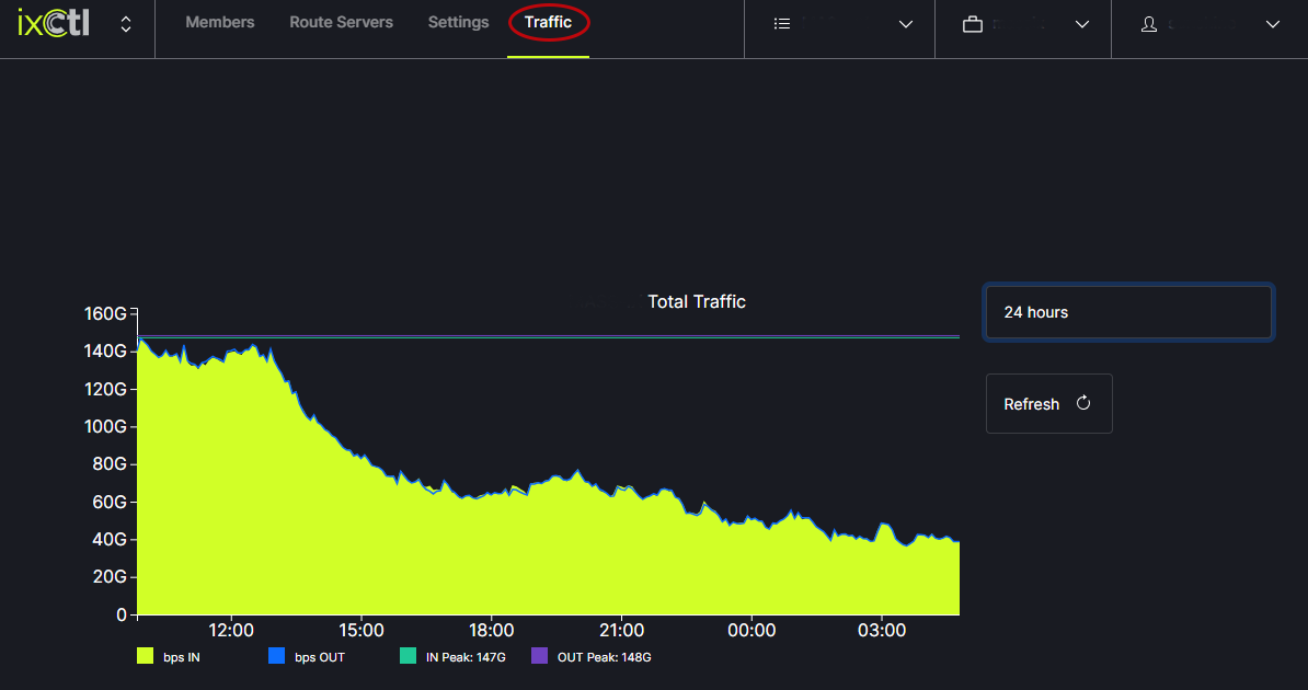 Add a Route Server A view of total traffic is available from the Traffic tab in the header menu. The time period displayed on the graph can be altered by using the dropdown menu on the right side of the window. Previous Next