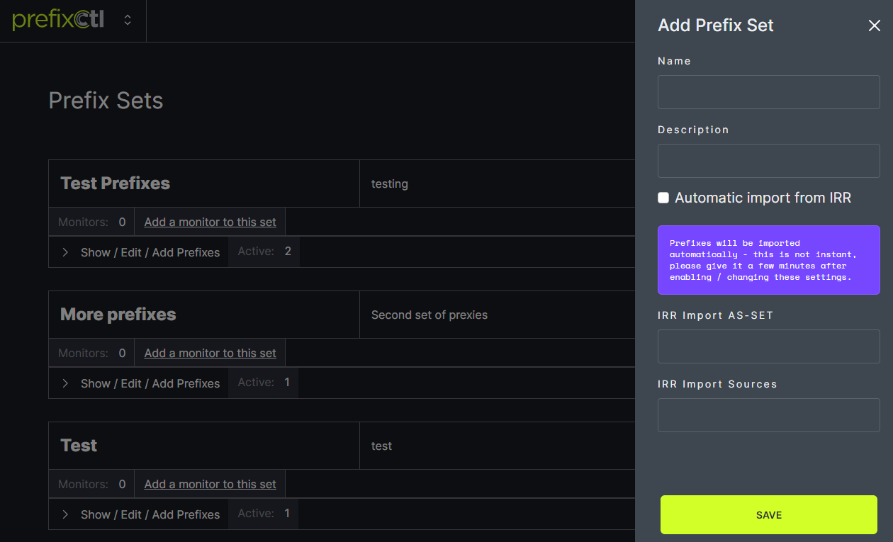 In the modal, fill in the name of the set and a short description. Click on Automatic import from IRR if you want IRR integration. When automatic IRR import is enabled the prefixes in this prefix set are managed automatically. Users are not able to add or remove prefixes from the prefix set when IRR import is enabled because updates are automatic. (This feature is experimental as of 3/2022). Fill in the IRR Import AS-SET and/or the IRR Import Sources. Click Save.